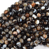 Faceted black brown stripe agate round beads. This strand is 14.5" long, about 6mm, 8mm, 10mm in diameter.