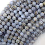 Natural brown blue lace agate round beads. This strand is 15.5" long, about 6mm, 8mm in diameter.