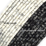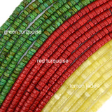 Natural various gemstones heishi disc beads in dyed turquoise howlite, lemon jade, unakite, blue goldstone, amethyst, blue sodalite, dalmatian jasper, grey map jasper, clear crystal quartz, fluorite, larvikite, blue aventurine, labradorite, blue spot jasper, African blood agate, red spider web jasper, dragon blood jasper, peach aventurine, yellow green chrysoprase, howlite, snowflake obsidian, mookaite, synthetic sea sediment jasper. The strand is 15" long, about 2x4mm.
