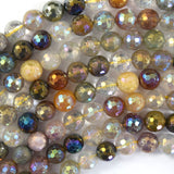 Mystic Titanium natural faceted multicolor rutilated quartz round beads. This strand is 15" long, about 6mm, 8mm, 10mm in diameter.