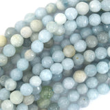 Natural faceted blue aquamarine round beads. The strand is 15.5" long, about 3mm, 4mm in diameter.