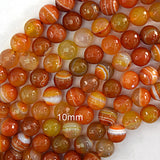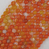 Faceted orange red stripe carnelian round beads. This strand is 14.5" long, about 6mm, 8mm, 10mm in diameter.