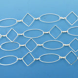 You are buying one foot of silver plated copper unfinished continuous oval diamond chain. The sizes are about 25x10x1mm, 15x15x1mm and 8x3x1.5mm. This item is sold by foot. We can cut according to your requirement.