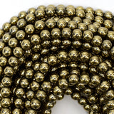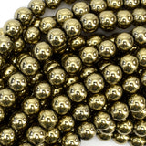 Pyrite colored hematite round beads. This strand is 15.5" long, about 4mm, 6mm, 8mm, 10mm in diameter.