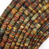 Natural multicolor picasso jasper heishi beads. This strand is 15.5" long, about 2x4mm, 3x6mm, 3x8mm.