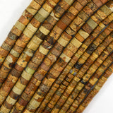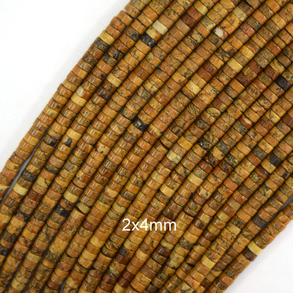Natural picture jasper heishi disc beads. This strand is 15" long, about 2x4mm, 3-4x6mm.
