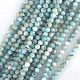 Natural micro faceted Dominique Republic blue larimar round beads. This strand is 15.5" long, about 4mm in diameter.