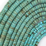 Greenish blue turquoise howlite heishi disc beads. This strand is 15" long, about 2x4mm, 3x6mm, 3x8mm.
