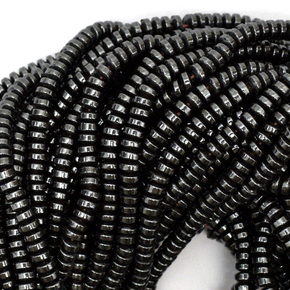 Natural hematite rondelle button beads. The strand is 15.5" long, about 3x4mm, 3x6mm, 3x8mm.