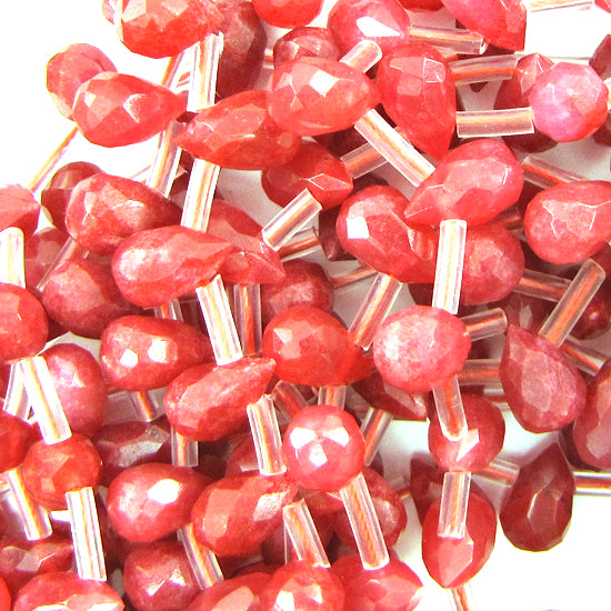 Faceted ruby red jade teardrop beads. This strand is 16" long, about 9-10mm high, 6mm in diameter, 40 beads.