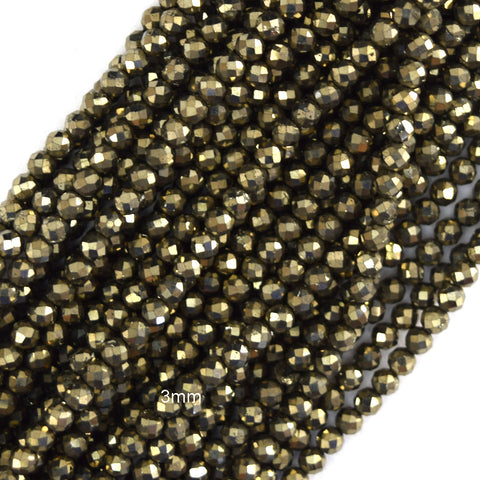 Natural Micro Faceted Pyrite Round Beads Gemstone 15.5" Strand 3mm 4mm